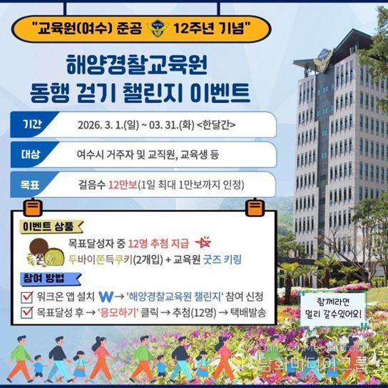 시민행정신문 이존영 기자 | 해양경찰교육원은 교육원 여수 준공 12주년을 기념해 오는 3월 1일부터 31일까지 한 달간, 여수 시민과 함께하는 비대면 걷기 행사 '해양경찰교육원 동행 걷기 챌린지'를 운영한다.