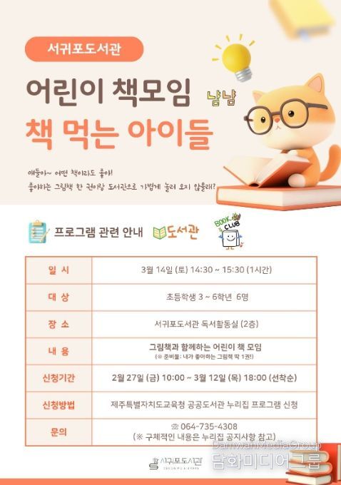 시민행정신문 기자 | 제주도교육청 서귀포도서관은 3월부터 12월까지 어린이들이 독서의 주체성을 확립하고 도서관을 능동적으로 이용하는 습관을 형성할 수 있도록 돕기 위해 어린이 대상 독서 모임인 ‘책 먹는 아이들’을 운영한다.