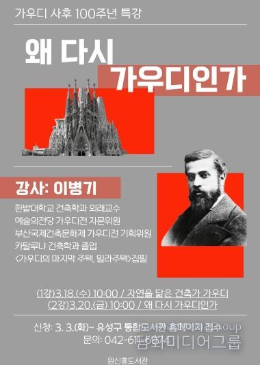 시민행정신문 강갑수 기자 | 대전 유성구는 3월 18일과 20일 이틀간 원신흥도서관에서 세계적인 건축가 안토니 가우디 사후 100주년 기념 건축 인문학 특강 ‘왜 다시 가우디인가’를 개최한다.