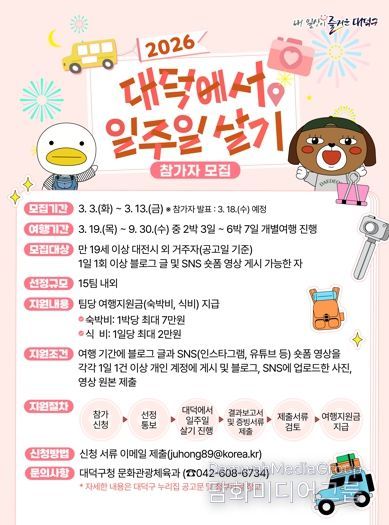 시민행정신문 강갑수 기자 | 대전 대덕구가 ‘2026 대덕에서 일주일 살기’ 참가자를 13일까지 모집한다.