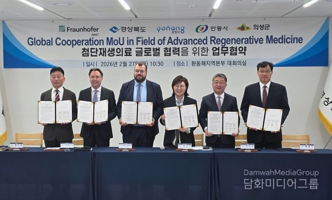 시민행정신문 강갑수 기자 | 안동시는 경상북도, 포항시, 의성군과 함께 2월 27일 환동해지역본부(동부청사) 9층 대회의실에서 독일 프라운호퍼 IBMT 연구소와 ‘첨단재생의료산업 육성을 위한 업무협약 (MOU)’을 체결했다.