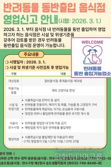 시민행정신문 강갑수 기자 | 연수구는 3월부터 반려동물을 동반한 손님도 일반음식점, 휴게음식점, 제과점 등을 이용할 수 있다고 밝혔다.