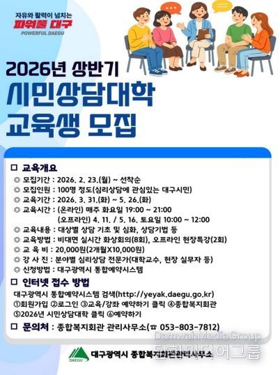 시민행정신문 강갑수 기자 | 대구광역시 종합복지회관은 오는 3월 31일부터 5월 26일까지 심리상담에 관심 있는 일반 시민과 상담 관련 종사자를 대상으로 ‘2026년 상반기 시민상담대학’을 운영한다.