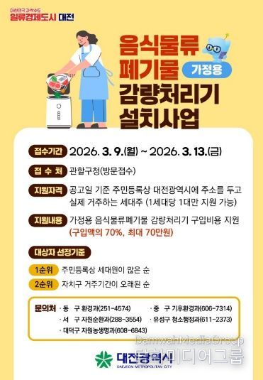 문창용 대전시 환경국장은 “가정용 음식물류 폐기물 감량처리기 보급은 가정 내 폐기물 감량 실천을 확대하고, 주거환경 개선과 자원순환도시 조성에도 도움이 될 것으로 기대된다”라며 “앞으로도 시민이 체감할 수 있는 생활밀착형 정책을 지속적으로 추진하겠다”라고 말했다.