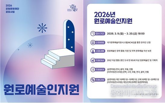 시민행정신문 강갑수 기자 | 강원문화재단은 강원특별자치도 원로예술인의 창작 활동을 지원하고 지역 문화예술 자산을 보존하기 위한 ‘2026년 원로예술인지원사업’ 공모를 접수한다.