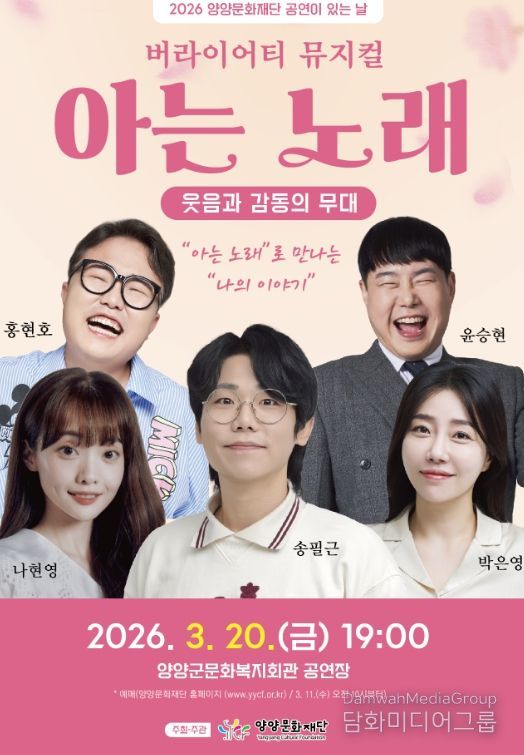 시민행정신문 강갑수 기자 | (재)양양문화재단이 2026년 새해 첫 공연으로 온 가족이 함께 웃고 즐길 수 있는 개그 뮤지컬 '아는 노래'를 오는 3월 20일 오후 7시 양양군 문화복지회관 공연장에서 개최한다.
