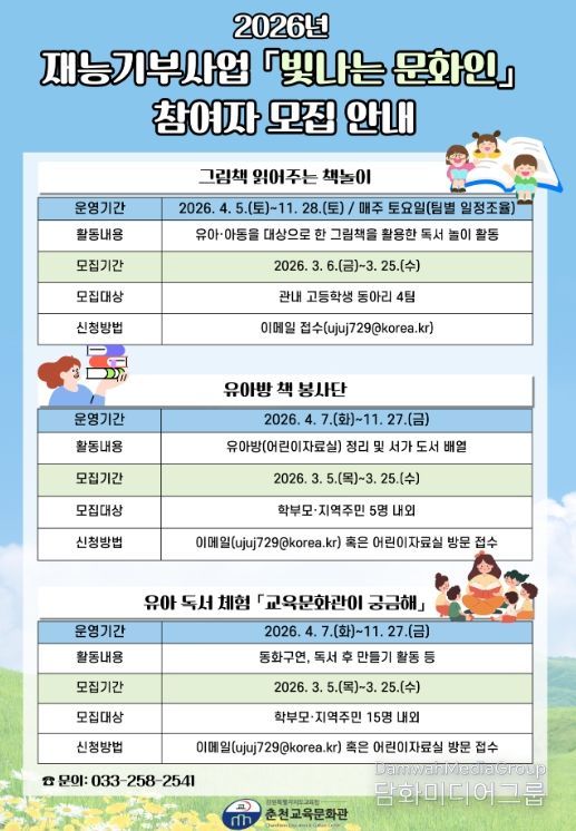 재능기부사업 '빛나는 문화인'은 △그림책 읽어주는 책놀이 △유아방 책 봉사단 △유아 독서 체험 ‘교육문화관이 궁금해’ 3개 분야로 운영되며, 참여자는 유아·어린이를 대상으로 독서 활동 지도, 도서 정리, 동화 구연 및 독서 체험 활동 등을 수행하게 된다.