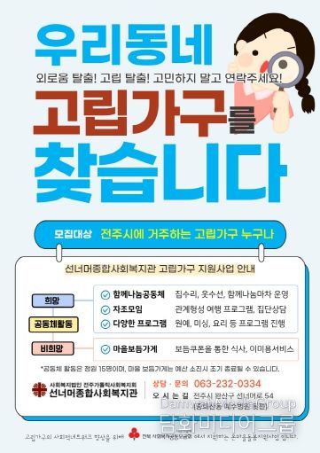 시민행정신문 강갑수 기자 | 전주시 선너머종합사회복지관은 전주시에 거주하는 고립가구의 사회적 고립 해소와 지역사회 관계망 형성을 지원하기 위한 ‘2026년 고립가구 지원사업’ 참여자를 모집한다고 6일 밝혔다.