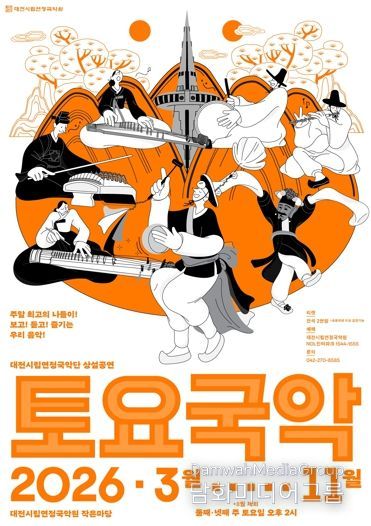 시민행정신문 기자 | 대전시립연정국악단의 시그니처 상설공연 ‘토요국악’이 3월부터 11월까지(8월 제외) 둘째, 넷째 주 토요일 오후 2시 국악원 작은마당에서 총 15회에 걸쳐 열린다.