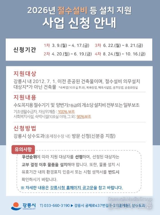 시민행정신문 강갑수 기자 | 강릉시는 지속되는 기상이변과 장기 갈수기(가뭄 때)로 원수 확보가 어려워짐에 따라, 시민들이 수돗물을 절약하고 효율적으로 사용할 수 있도록 ‘2026년 절수설비 등 설치 지원사업’을 추진한다.