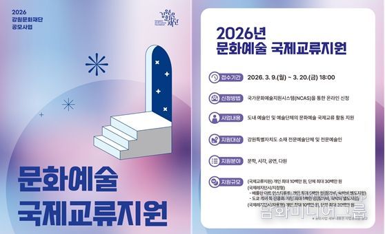 시민행정신문 강갑수 기자 | 강원문화재단은 도내 예술인의 해외 교류 활동을 지원하고 강원 문화예술의 국제 경쟁력을 높이기 위한 ‘2026년도 문화예술 국제교류지원’ 사업 접수를 9일부터 20일까지 진행한다.