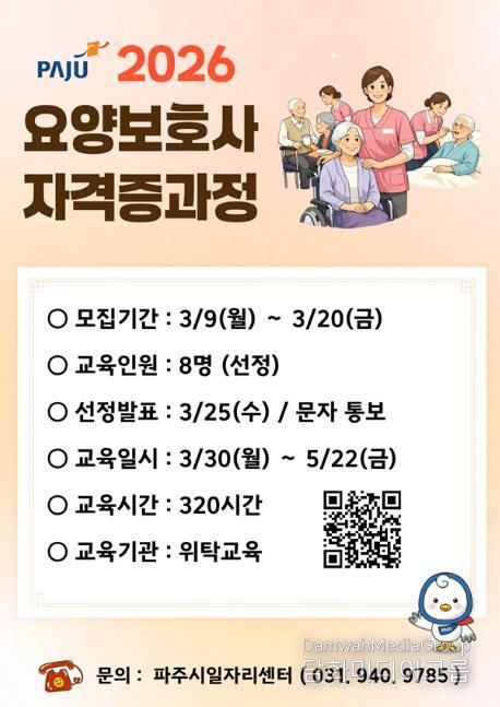 모집 기간은 3월 9일부터 3월 20일까지이며, 신청 대상은 요양보호사로 취업을 희망하는 파주시 거주 구직자다.
