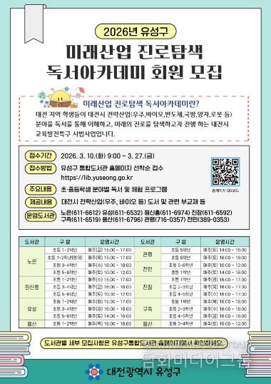 시민행정신문 강갑수 기자 | 대전 유성구는 4월부터 12월까지 관내 8개 공공도서관에서 초·중학생을 대상으로 ‘2026년 미래산업 진로 탐색 독서아카데미’를 운영한다.