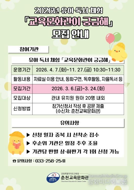 시민행정신문 기자 | 춘천교육문화관은 4월 7일부터 11월 27일까지 관내 유치원 원아를 대상으로 유아 독서 체험 프로그램 ‘교육문화관이 궁금해’를 운영한다.
