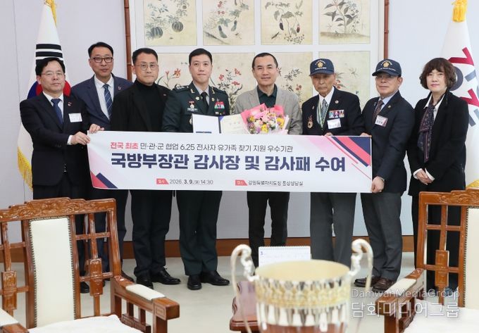 시민행정신문 강갑수 기자 | 강원특별자치도는 국방부 유해발굴감식단이 추진한 ‘2025년 민·관·군 협업 6·25전사자 유가족 집중 찾기’ 사업에서 전국 최초 민관군 협업 6.25전사자 유가족 찾기 지원 우수기관으로 선정돼, 3월 9일 국방부장관으로부터 감사장과 감사패를 수상했다고 밝혔다.