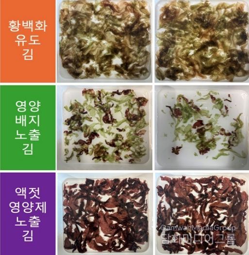 실내 실험에서는 동일한 황백화 김을 3개 군으로 나눠 △일반 해수 △영양염 배지를 첨가한 해수 △액젓 찌꺼기 치료제를 투입한 해수에 넣어 비교 관찰했다.
