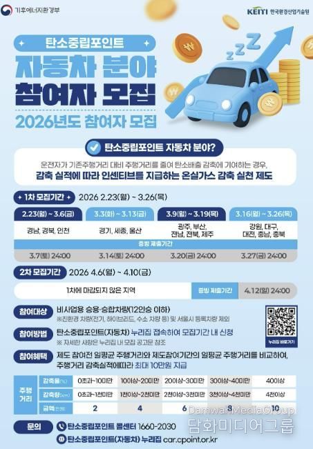 참여자는 주행거리 감축 실적에 따라 최대 10만 원의 보상금을 받을 수 있으며, 보상금은 12월에 현금으로 지급된다. 올해 모집 규모는 296대이다. 신청을 원하는 시민은 3월 16일부터 3월 26일까지 자동차 탄소중립포인트제 누리집에서 접수하면 된다.
