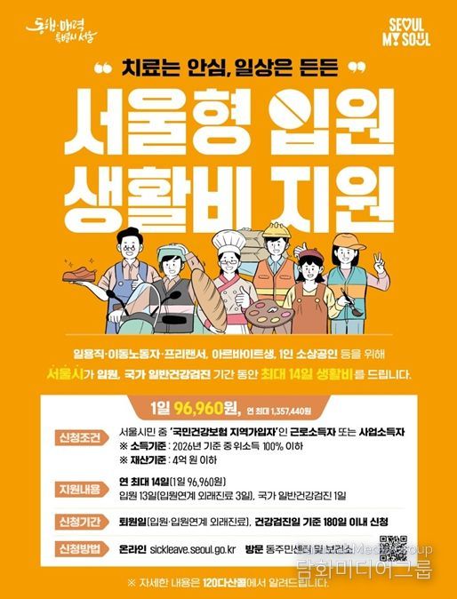 시민행정신문 이존영 기자 | 서울시는 일하는 시민이 치료를 위한 입원이나 건강검진으로 발생하는 소득 공백을 지원하는 ‘서울형 입원생활비 지원’ 사업의 지원 기준을 완화하고 1일 지원 금액을 96,960원으로 확대한다고 밝혔다.