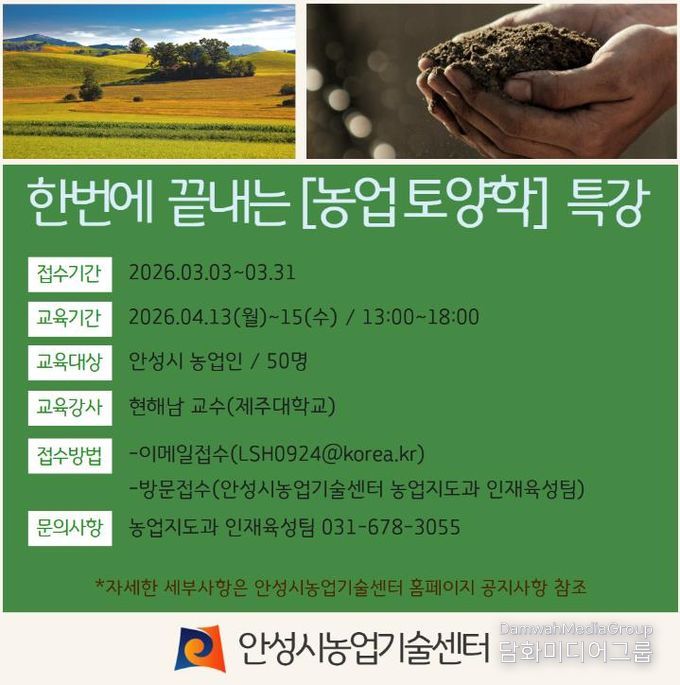 이번 특강은 기후 변화에 대응해 농업 현장의 토양 문제를 해결하고 농산물 생산성을 높이기 위해 마련됐다. 교육은 토양의 기초부터 심화 과정까지 폭넓게 다루며, 오는 4월 13일부터 15일까지 사흘간(총 15시간) 안성시농업기술센터에서 진행된다.