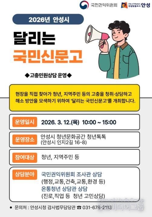 시민행정신문 강갑수 기자 | 안성시는 오는 12일 오전 10시부터 오후 3시까지 청년문화공간 ‘청년톡톡’(인지2길 16-8)에서 국민권익위원회와 함께 ‘달리는 국민신문고’를 운영한다.