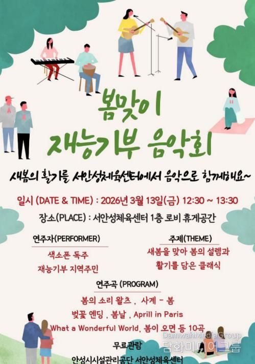 시민행정신문 기자 | 안성시시설관리공단은 오는 3월 13일 오후 12시 30분부터 서안성체육센터 1층 로비에서 ‘봄맞이 지역주민 재능기부 음악회’를 개최한다고 밝혔다.
