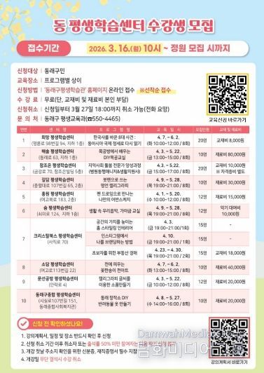 수강 신청은 3월 16일 오전 10시부터 동래구 평생학습관 누리집을 통해 온라인으로 접수할 수 있으며, 동래구민을 대상으로 선착순 모집한다. 수강료는 무료이며 교재비 및 재료비 등은 학습자가 부담해야 한다.