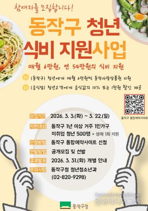 박일하 동작구청장은 “지속되는 고물가 속 식비 부담으로 어려움을 겪는 구직 청년들에게 실질적인 도움을 주고, 지역경제에도 활력을 불어넣기 위해 이번 사업을 마련했다”며 “앞으로도 청년들이 취업 준비에 전념할 수 있도록 체감도 높은 정책을 지속적으로 발굴해 나가겠다”고 말했다.