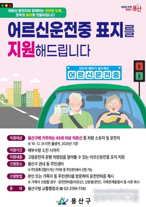 시민행정신문 강갑수 기자 | 서울 용산구는 올해도 고령운전자 안전을 위한 ‘어르신 운전중’ 표지 배부 사업을 추진한다고 밝혔다. 지난해 첫 시행에 이어 2년 연속 진행하는 사업으로, 고령 운전자를 배려하는 안전한 교통 환경을 만들기 위한 취지다.