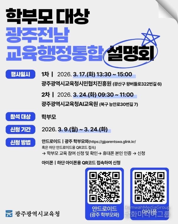 시민행정신문 기자 | 광주시교육청이 학부모의 교육행정통합 궁금증을 해소하기 위해 두 차례에 걸쳐 ‘광주·전남 교육행정통합 설명회’를 개최한다.