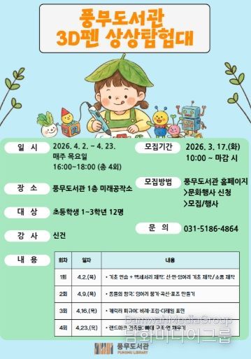 시민행정신문 기자 | 김포시 풍무도서관은 초등학생 1~3학년을 대상으로 ‘3차원 펜 상상탐험대’를 오는 4월 2일부터 4월 23일까지 매주 목요일 오후 4시부터 6시까지 총 4회에 걸쳐 운영한다.