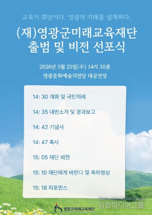 시민행정신문 강갑수 기자 | 영광군미래교육재단은 오는 3월 25일 오후 2시 30분, 영광문화예술의전당 대공연장에서 '영광군미래교육재단 출범 및 비전선포식'을 개최한다.