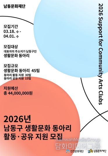시민행정신문 강갑수 기자 | 인천문화재단과 남동문화재단은 ‘2026년 남동구 생활문화 동아리 지원사업’에 참여할 동아리를 공개 모집한다고 12일 밝혔다.