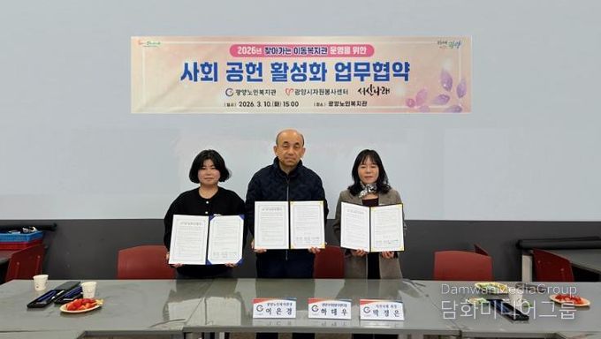 시민행정신문 강갑수 기자 | 광양노인복지관은 지난 10일 복지관에서 지역사회 공헌 활동을 확대하고 민·관 협력체계를 구축하기 위해 광양시자원봉사센터, 서산나래와 업무협약을 체결했다.