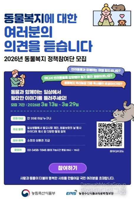 시민행정신문 강갑수 기자 | 농림축산식품부는 반려동물과 함께 생활하는 반려인 그리고 동물과 함께 생활하는데 관심이 많은 국민들의 의견을 듣기 위해 ‘농림축산식품부와 함께 하는 동물복지 정책참여단’을 모집한다고 밝혔다.