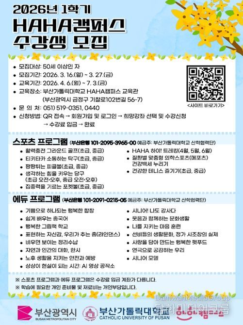 시민행정신문 강갑수 기자 | 부산시는 오는 3월 16일부터 27일까지 50세 이상 어르신을 대상으로 '2026년 하하캠퍼스 프로그램' 상반기 수강생을 모집한다고 밝혔다.