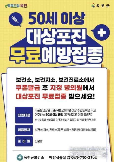 '옥천군 대상포진 예방접종 지원에 관한 조례'에 따라 2024년에는 60세 이상, 2025년에는 55세 이상, 2026년부터는 50세 이상 옥천군민에게 대상포진 무료 예방접종을 지원하고 있다.