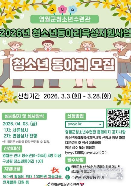 시민행정신문 강갑수 기자 | 영월군청소년수련관은 지역 청소년들의 자율적인 참여와 성장을 지원하기 위해 '2026년 영월군청소년수련관 청소년 동아리 육성 지원사업'에 참여할 청소년 동아리를 모집한다.