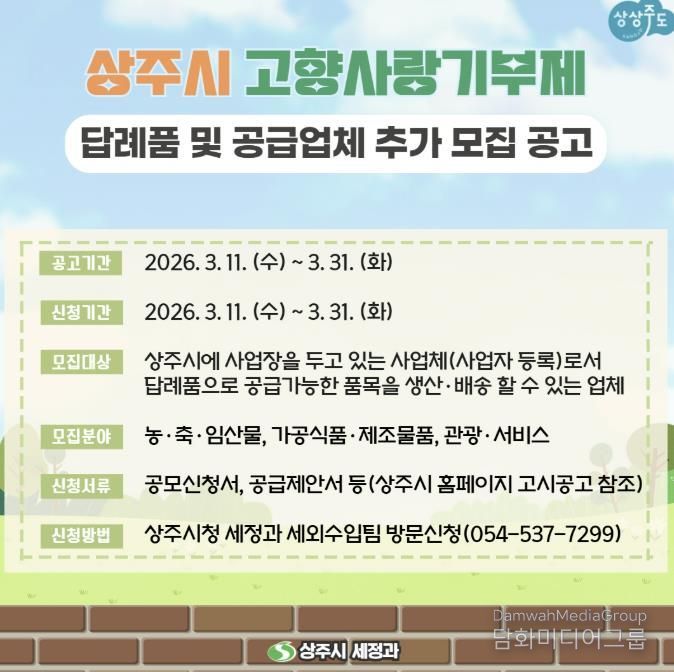 시민행정신문 강갑수 기자 | 상주시는 고향사랑기부제 활성화와 지역경제 발전을 위해 고향사랑기부제 답례품 및 공급업체를 추가 모집한다.
