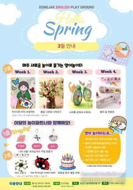 동작어린이영어놀이터에서는 3월 3일부터 31일까지 ‘헬로 스프링(Hello Spring)’을 주제로 영유아 및 초등 저학년을 위한 테마활동과 원데이 클래스를 선보인다.