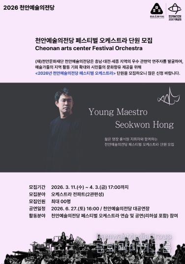 시민행정신문 강갑수 기자 | 천안문화재단은 내달 3일까지 천안예술의전당 페스티벌 오케스트라 단원을 모집한다고 13일 밝혔다.