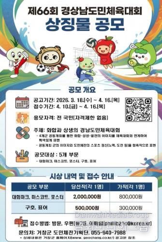 이광희 도민체전기획단장은 “4개군의 정체성과 화합·상생의 경상남도민체육대회를 잘 어우러지게 담아낼 수 있는 참신한 작품들이 접수되기를 기대한다”며 “2027년 경상남도민체육대회에 대한 전 국민의 관심과 참여를 바란다”고 말했다.