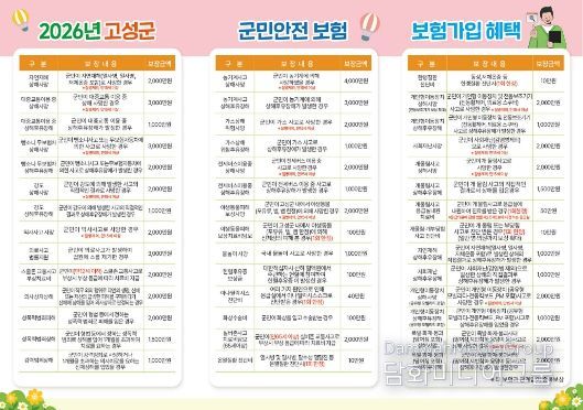 시민행정신문 강갑수 기자 | 고성군은 일상생활 중 예상치 못한 각종 재난 및 사고 등으로 인해 군민이 피해를 당할 경우, 이를 보장할 수 있도록 전년도 보다 보장 범위를 넓혀 2026년 군민안전보험에 가입했다고 밝혔다.