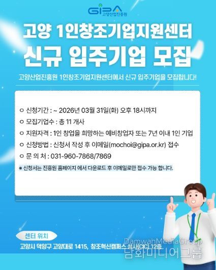시민행정신문 이세훈 기자 | 고양산업진흥원이 ‘고양 1인 창조기업 지원센터’ 2026년 1차 신규 입주기업을 모집한다.