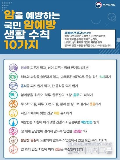 주요 수칙으로는 ▲금연·금주 ▲균형잡힌 식단으로 싱겁게 먹기 ▲주 5회 이상 운동 및 건강 체중 유지 ▲예방접종(B형 간염, 자궁경부암) ▲정기적인 암 검진 등이 있다.
