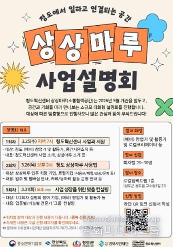 청도군 관계자는 “상상마루는 청도에서 일하고 연결되는 새로운 공동체 삶을 지향하는 곳으로 이번 사업 설명회를 통해 지역의 창의적인 인재들과 활동가들이 모여 청도의 미래를 함께 그려나가는 기회가 되기를 바란다”고 전했다.