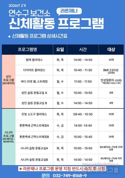 연수구보건소 관계자는 “이번 프로그램은 구민이 일상에서 꾸준히 신체활동을 실천할 수 있도록 돕기 위한 건강증진 사업”이라며 “앞으로도 다양한 운동 프로그램을 통해 구민들의 건강한 생활을 적극 지원하겠다.”라고 말했다.