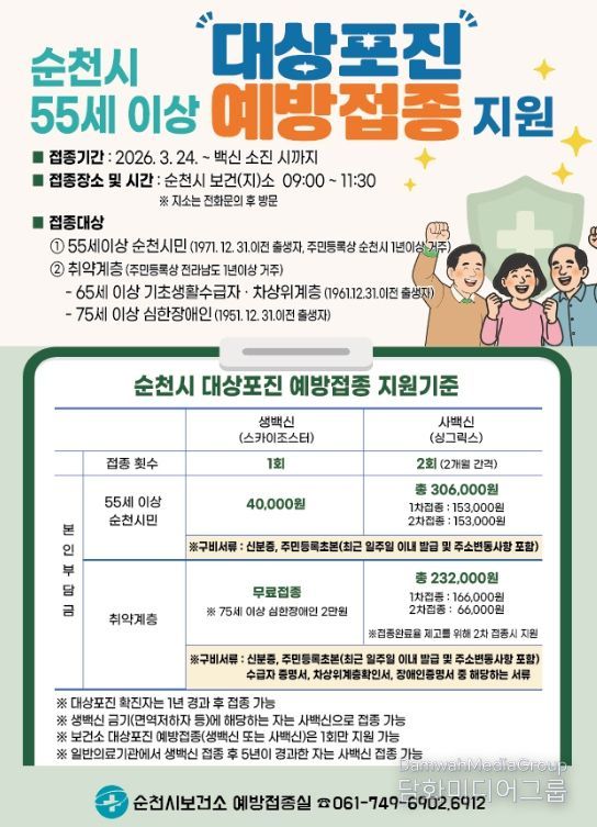 시민행정신문 강갑수 기자 | 순천시는 시민의 건강 보호와 예방접종 선택권 확대를 위해 대상포진 예방접종 사업에 사백신(유전자재조합백신)을 추가해 오는 24일부터 시행한다고 밝혔다.