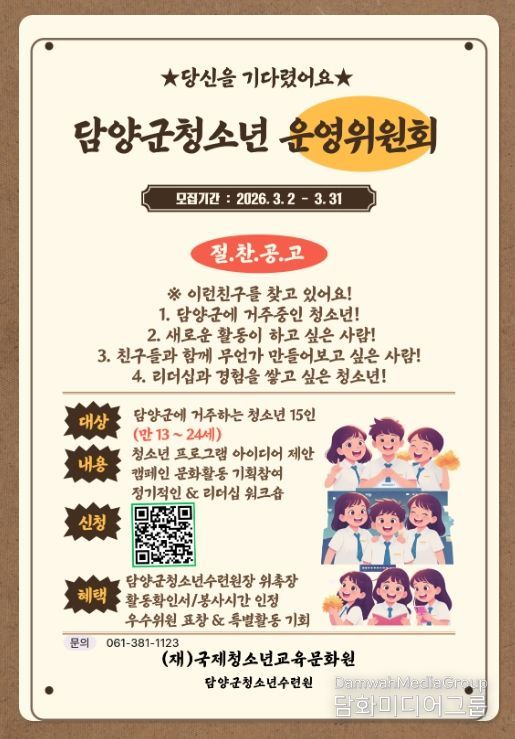시민행정신문 강갑수 기자 | 담양군청소년수련원이 청소년이 직접 수련시설 운영에 참여하고 다양한 정책과 프로그램을 제안하는 ‘청소년운영위원회’ 신규 위원을 모집한다.