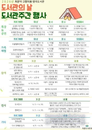 시민행정신문 강갑수 기자 | 창원특례시 의창도서관과에서는 2026년 도서관의 날(4.12.)과 도서관주간(4.12.~4.18.)을 맞아, 최윤덕·고향의봄·명곡도서관에서 4월 9일부터 4월 23일까지 다양한 독서문화행사를 운영한다고 밝혔다.