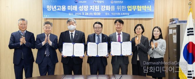 익산시는 고용노동부 익산지청, 원광대학교와 함께 24일 시청에서 '청년고용 미래 성장 지원 강화를 위한 업무협약'을 체결했다.